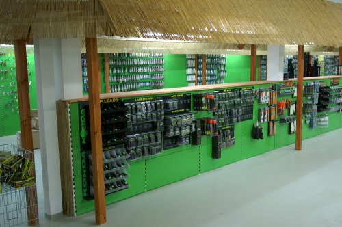 Für den Anglerbedarf in Dresden wurden von uns farbige Regalböden und Regalwände geliefert, die individuell in bestehende Seitenwände eingefügt wurden.